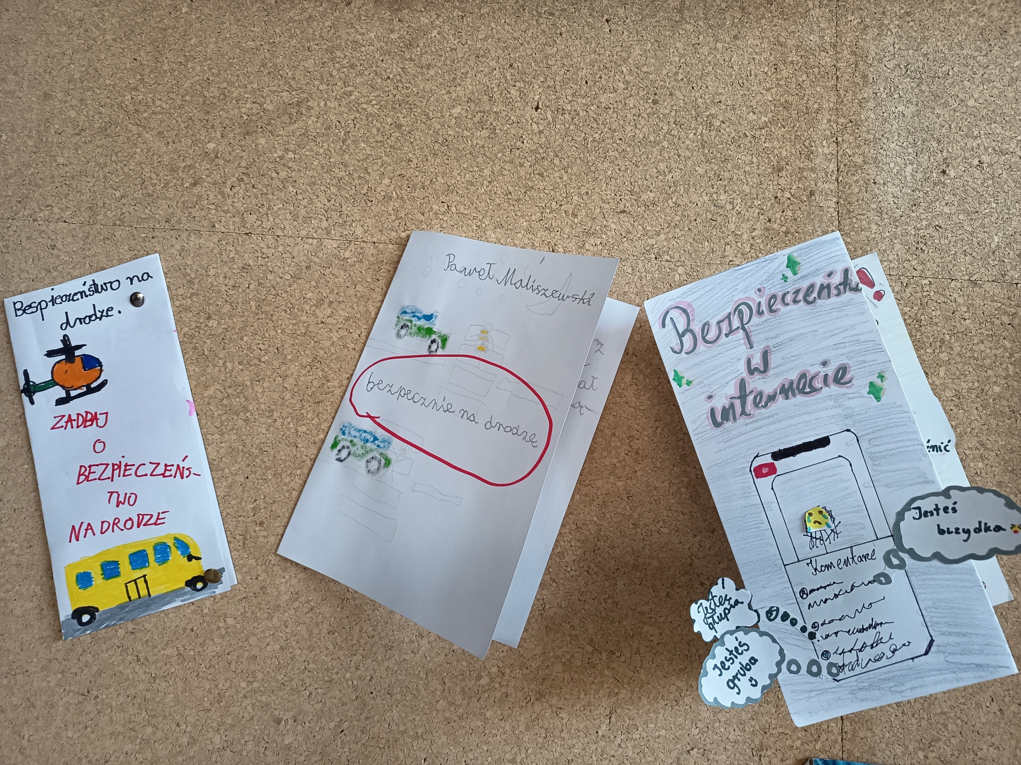 W klasach 7 uczniowie nakręcili filmy na temat uzależnień i bezpieczeństwa, co jest ważnym elementem edukacji społecznej. Plakat o wykluczeniu i bezpieczeństwie przygotowali uczniowie klasy 4, natomiast klasy 5-6 stworzyły ulotki poruszające podobną tematykę, promującą wzajemne zrozumienie i troskę.