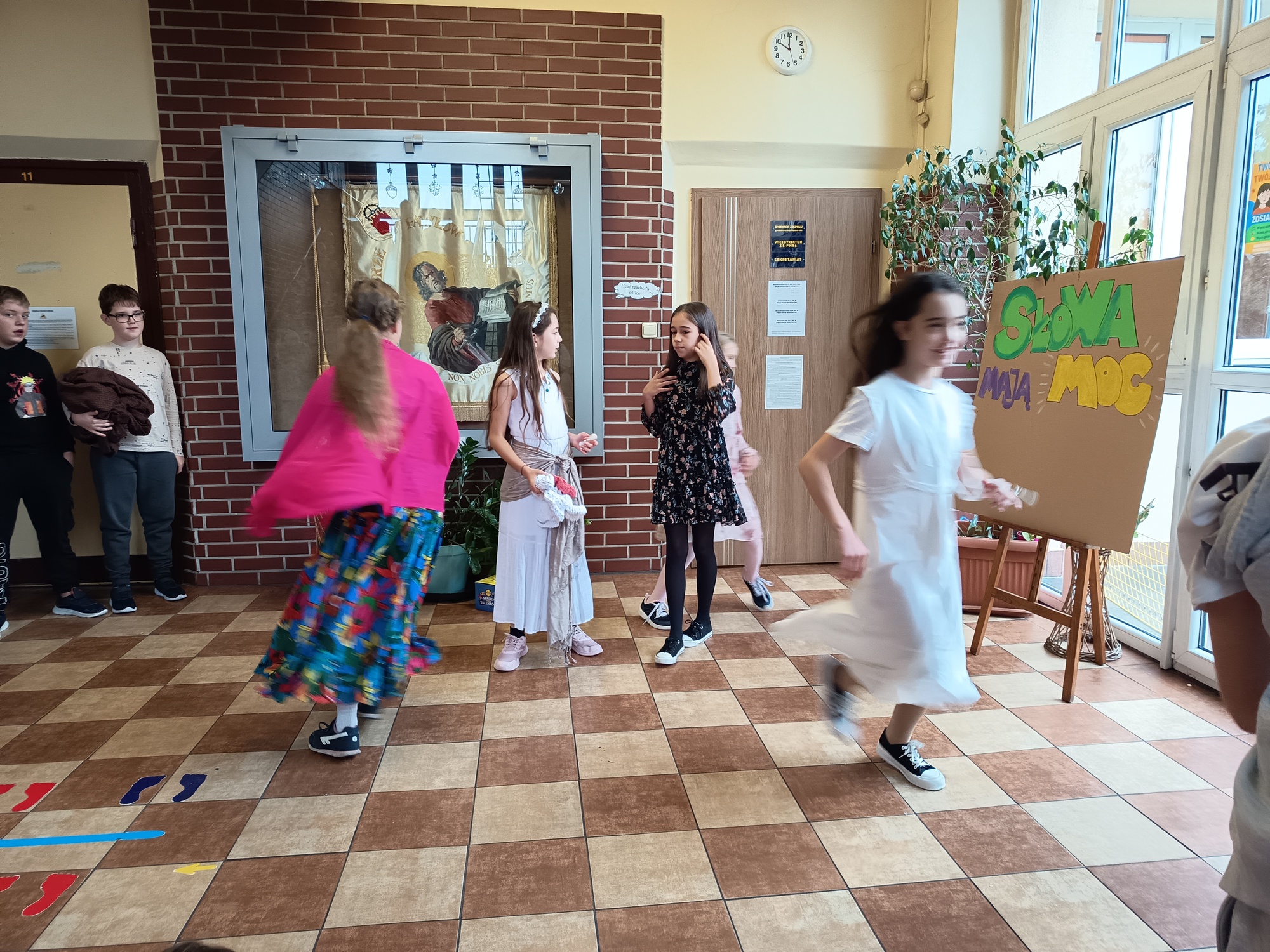 W klasach 1-3 uczniowie odgrywali scenki dramowe z różnymi sytuacjami społecznymi, ucząc się jak ważne są dobre relacje i wzajemny szacunek. Dodatkowo wykonali piórka dobrych słów, które ozdobiły „skrzydła” projektu „Słowa mają MOC”, przypominając, jak istotne jest, aby nasze słowa były pełne życzliwości i wsparcia.